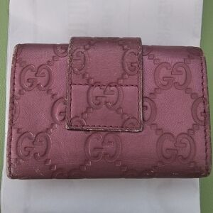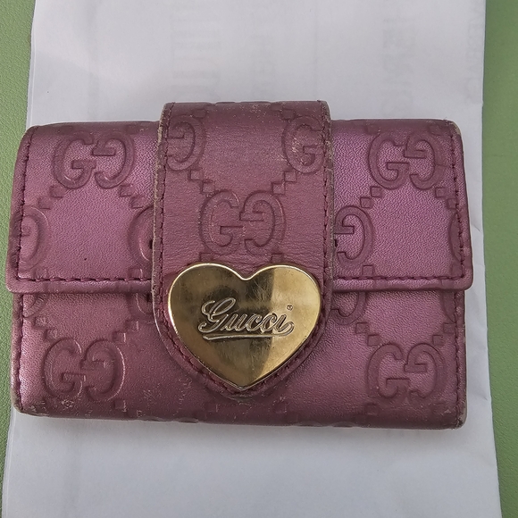 Elegant Gucci 6 ring key holder/wallet in a chic pink leather design. Features a stylish heart-shaped gold accent. Perfect for adding a touch of luxury to your everyday essentials.