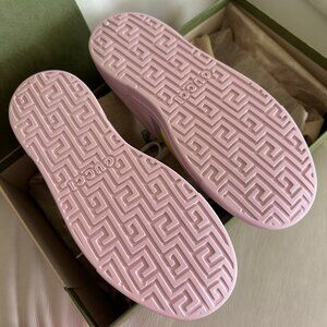 Stylish pink mules with yellow and gray stripes. Comfortable and chic design.