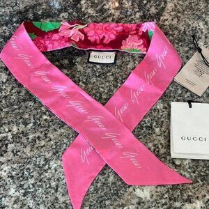 Chic Gucci scarf from Gucci features a whimsical floral print on one side and a Gucci Logo on the other. Luxurious silk fabric. Perfect for your hair, neck, wrist or favorite bag!🌸 Preloved with normal signs of wear! Tags included in photos-not attached. Made in Italy. 33” x 2”
