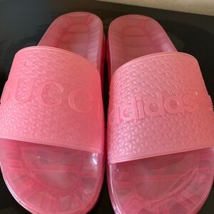 Stylish pink slide sandals. Embossed logo design. Comfortable and chic.