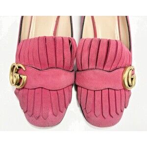 Gucci Pink Suede GG Marmont Fringe Detail Block Heels Gold Accent Sz EU 36.5