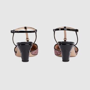 These Gucci heels feature a striking pink glitter toe and sleek black straps, creating a sophisticated T-strap design. The pointed toe and medium-height heel add elegance and style, perfect for making a statement at any event.