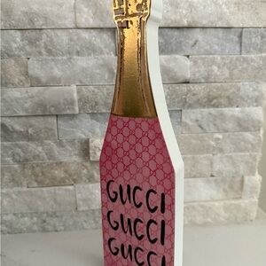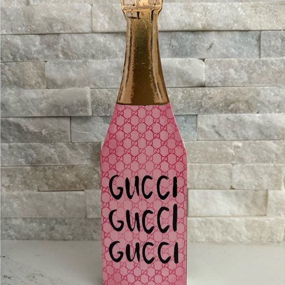 Add luxury to your party with this Gucci bottle decor. Pink and gold design for a chic touch.