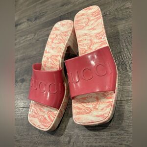 Stylish Gucci slide sandals. Pink strap with embossed logo. Marble-patterned sole.