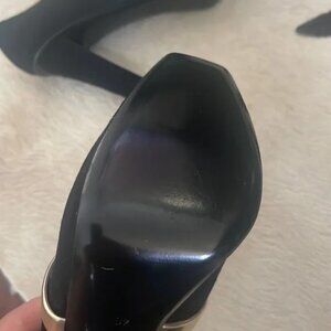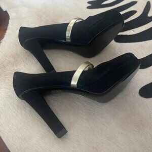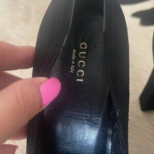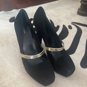 Brand new-never used Gucci Suede Platform Heels size 40. Black smooth suede with a gold leather band accent 1” platform/4.5” heel height. No box, beautiful Classic Heels, just way too small for me. Previously purchased here and am listing to try to recoup my costs. These are originally over $900.