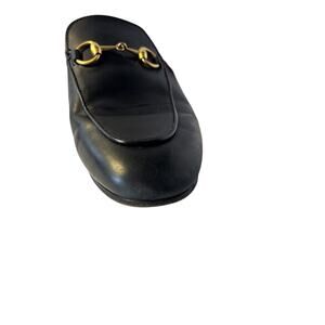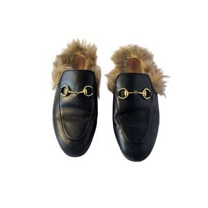Gucci Princetown Black Leather Fur Lined Horsebit Mules Size 5.5 Designer Italy