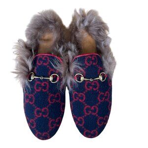 Gucci Princetown Fur-Lined Mule Slippers in Navy GG Wool Size 38.5