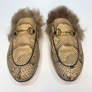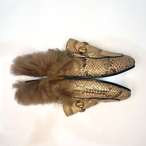 Gucci Princetown Fur Slipper EU 37 US 7 Python Print Horsebit Mule Loafer Flats