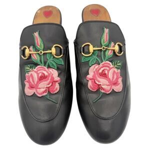 Gucci Princetown Floral Embroidered Horsebit Loafer Slip-On Flat Mules in Black Leather EU 41 US 11