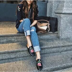 Elevate your style with these authentic Gucci Princetown Loafer Mules crafted from smooth black leather. These slip-on loafers feature the iconic horsebit buckle accent and a floral embroidery applique, creating a classic yet contemporary look. Designed with an almond toe for a sophisticated finish, these loafers are crafted with a padded leather footbed and flat heel for optimal comfort and durability, making them perfect for everyday wear.
