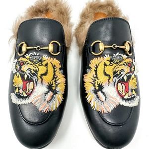 Gucci Princetown Tiger Fur Lined Round Toe Horsebit Canvas Flat Loafer Mules