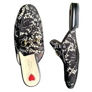 Gucci Princetown authentic women's Lace Black/Cream Horsebit Flats mules Size 36