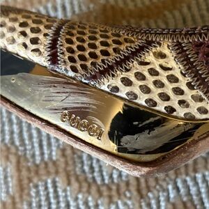 Brown, burgundy and beige snakeskin Gucci pointed-toe pumps with metallic bronze leather insole lining and covered heels.
