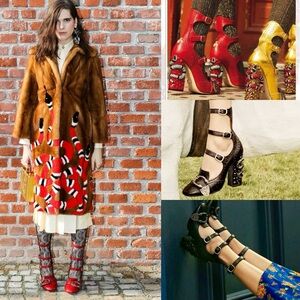 Gucci Queercore Brogue heels. Red hibiscus. Caged ankle straps, detailed buckle on the toe. Heel is embellished with Swarovski crystals and snake motif. Back of the ankle has an embroidered bee. Gently used condition- minor wear on leather mostly on toes and heels, only noticeable when inspecting them. Scuffing on soles and heel caps per normal wear. Size 37.5 dust bag and box show wear.