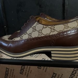 Monogram in Gucci logo, these are canvas and leather in both brown and tan.