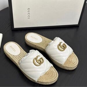 Chic Gucci espadrilles with quilted white design. Gold logo accent. Ideal for casual elegance.