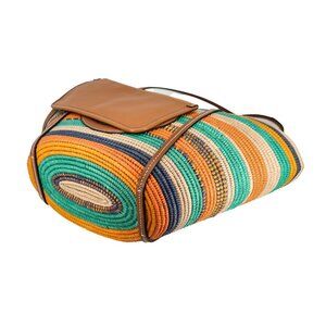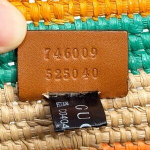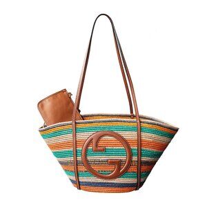 Presented in a natural, green and red striped raffia, this medium tote bag is contrasted by a defined Round Interlocking G leather patch. Colors, prints, and emblems appear consistently across time-honored silhouettes, demonstrating the House's ability to reinvent signature pieces season after season.