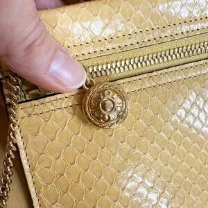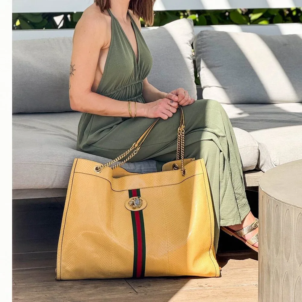 Beautiful soft yellow python snakeskin Rajah tote bag with jeweled tiger head detail. There are two chain straps to carry by hand or wear on the shoulder. Includes matching interior pouch. This is the very rare maxi size, the largest version of this bag. Never used. Dust bag included.