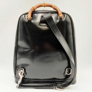 Rare vintage **Gucci Bamboo Backpack** from the Tom Ford era. Crafted in **black patent leather + durable canvas** with Gucci’s signature **bamboo top handle**. Features a **front zip pocket**, **zip-around top closure**, and **adjustable strap** that can be worn as a backpack or sling. Interior lined with Gucci’s grey diamante fabric, includes logo tag + zip pocket.
