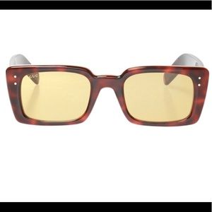 Defined by a rectangular frame, these spectacles play with the contrast between two different layers of acetate: tortoiseshell, backed by white acetate with a horn-like effect. The Gucci script emphasizes the straight temples.