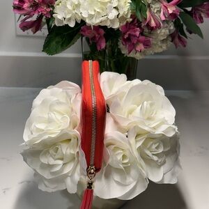 Chic Gucci zippy wallet in vibrant coral leather. Features iconic logo and tassel detail. Stylish and functional. Preowned. Normal signs of wear. No stains inside & out. No tears or holes. Light rubs & darkened on the edges. Light scratches on the surface. Zipper runs well. Very clean interior. 6 compartments, coin case & 12 card slots.