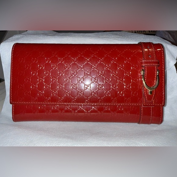 The Gucci Microguccissima patent leather wallet in red features a distinctive embossed logo pattern and a functional horsebit buckle detail.