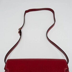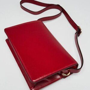 The exterior leather is clean and beautiful throughout with no wear. The goldtone metal ring on the flap has left indentations on the leather below. The shoulder strap remains clean with light creasing from the buckle. The goldtone hardware is bright and crisp throughout. The interior lining remains clean but the underside of the flap has some scuffing and light wear present.