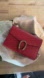 Chic red leather clutch by Gucci. Features elegant chain strap and signature detailing. Comes with box and linen bag