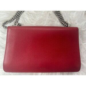 This luxurious Gucci shoulder bag is crafted from premium red leather and features a stunning tiger head closure adorned with intricate embellishments. Its chain strap provides both elegance and versatility, making it a standout accessory for sophisticated wardrobes. Crafted with attention to detail, this bag reflects Gucci's iconic design and timeless quality. Slight wearing on snap closure and few stains on the interior, seen in pics.