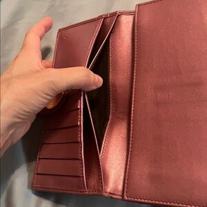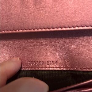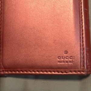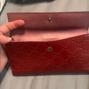 Chic Gucci wallet in red leather. Features embossed logo pattern. Heart-shaped clasp adds charm. Inside of wallet is a pink satin color. Last picture has the Gucci mark in numbers. Does not have any flaws. Final sale, no returns