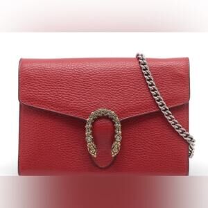 Elevate your style with this Gucci red leather shoulder bag. Featuring a sleek design and a chic chain strap, it's perfect for any occasion. Please note bag is in AWESOME CONDITION but it is missing 1 stone. Please see pictures for description thank you.