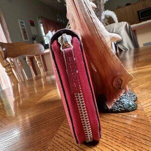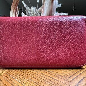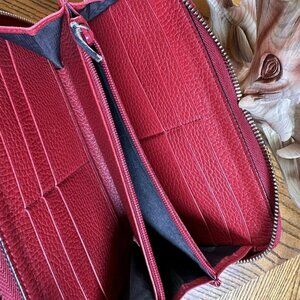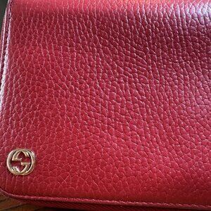 Elegant red leather wallet by Gucci. Features a zip-around closure. Stylish and functional.