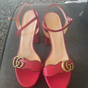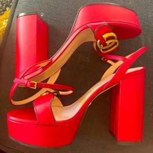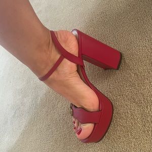 Bold red platform heels. Strappy design with gold buckle. Perfect for a statement look.