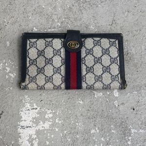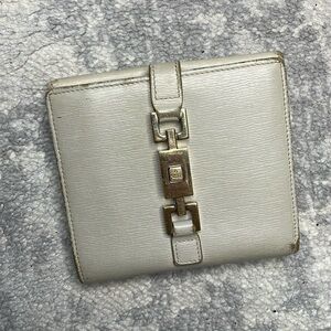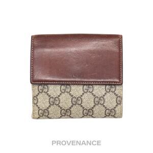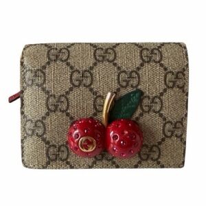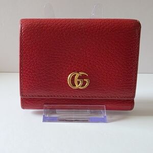Elegant red leather card holder with gold GG emblem. Features quilted chevron pattern.