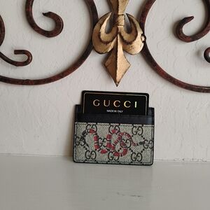 This luxurious Gucci accessory combines the elegance of red and black hues with a striking snake motif, making it a standout piece in the key and card holder category. Crafted with attention to detail, it showcases the brand's commitment to quality and style, perfect for keeping your essentials organized in a fashionable manner.