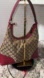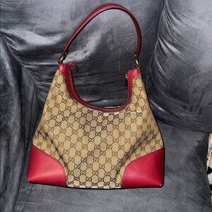 Chic Gucci shoulder bag with red leather accents. Iconic GG pattern in tan. Perfect for stylish outings.