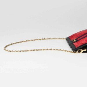This chic and refined Ophidia bag from Gucci is sure to be your new favorite. This bag features rich red suede paired with goldtone hardware and glossy patent leather trim. This bag looks glamorous and sophisticated when carried in hand or under the arm. The interior boasts two main compartments with a magnetic frame top closure, which makes this an ideal clutch for the super chic fashionista. Retail price is $2300