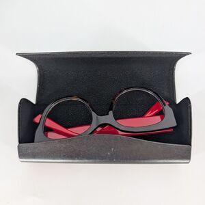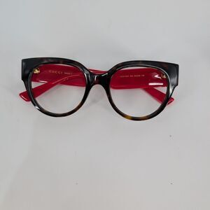 These Gucci glasses showcase a chic cat-eye design with a bold blend of red and brown colors. The substantial frame exudes luxury and style, making them a perfect accessory for any fashion-forward look.