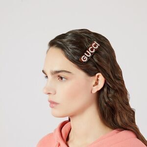 Hair clips and accessories continue to enrich collections in unexpected ways. Inspired by similar styles that appeared on the runway, the hair chip is decorated with the Gucci logo in sparkling rhinestones.