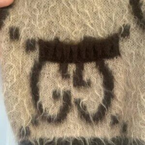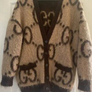 Beige/brown mohair-wool blend GG reversible cardigan from GUCCI featuring V-neck, front button fastening, long sleeves, ribbed cuffs, ribbed hem, two front patch pockets, reversible and GG pattern.