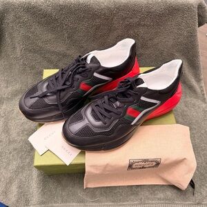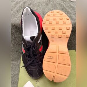 Gucci men's sneakers in black with red cushioned soles. Signature green and red web stripe on the sides. Lace-up design with textured leather and mesh panels. Chunky sole with tan outsole edge.