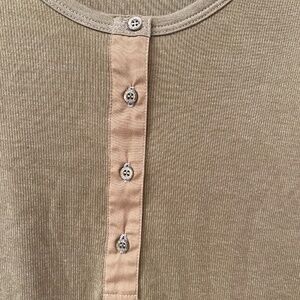 Style: It features a ribbed knit, short sleeves, a henley neckline with button closure, and cuffed sleeves.