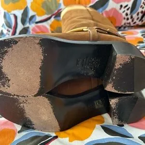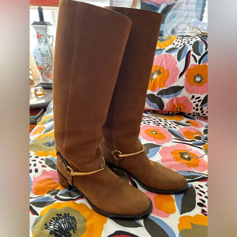 Tall riding boot with gold tone bit accent. Worn twice. Great condition but small scuffs on toes. No category for riding boot so I placed in over the knee though it comes below knee.