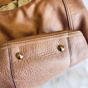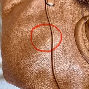 The purse does show signs of wear and is in good condition. Light fading of the metallic pink exterior, some wear on handles and some very light spots on inside fabric. A very light pen mark which is very hard to see. All flaws pictured.