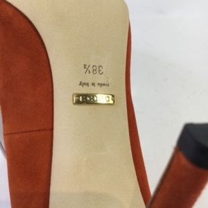 These are gorgeous rust colored suede Gucci pumps that come with the original box and dustbag. Have never been worn but may have been tried on. No marks that I can see on the shoes. They have an approx. heel heigh of 3.6" and are size 38.5 EU. Please note that all EU sizing may run small. They also have gold GG details on the back of the heel and gold plate on the sole of the shoe. These are stunning shoes that deserve a good home! Ask any questions.