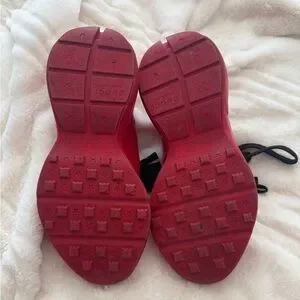 Bright red mens sneakers with black laces. Comfortable, durable design for everyday wear. Easy to put on and secure fit.