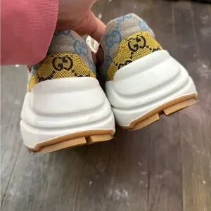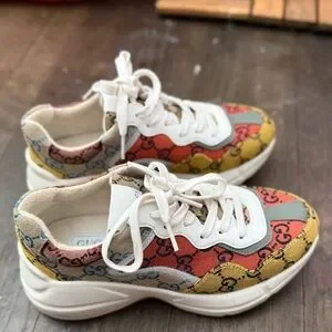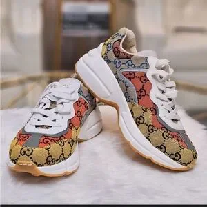 Vibrant Gucci sneakers with iconic GG pattern. Bold and stylish design. Perfect for a standout look.