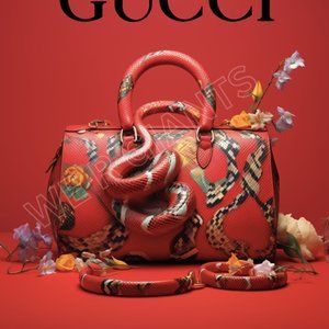 Add a touch of luxury to your space with this beautiful Gucci SNAKE PURSE print. Measuring at 11 x 14 inches, this piece is perfect for any art lover or fashion enthusiast. The print features a stunning depiction of a Gucci purse adorned with a snake design, adding a unique and stylish touch to any room. This art print is perfect for framing and displaying on a wall or as a centerpiece on a table. Ideal for those who appreciate high-end fashion and unique art pieces.
