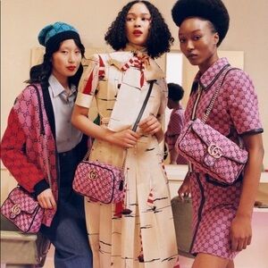 Gucci SS21 Pink GG Canvas Skirt with Leather Trim in size 40. Brand new with tags! No flaws or signs of wear. A pink canvas skirt showcases the original GG motif. Gucci Summer 2021 Rainbow Colorblock Ouverture Collection. Flap pockets with button closure.