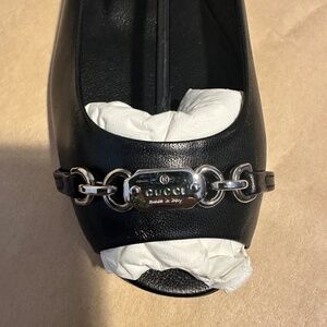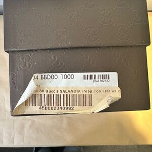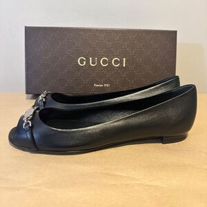 The Gucci Salandia Peep Toe Flat in size 38 is a stylish and versatile shoe designed for casual occasions. Made with black leather, this flat feature a classic peep toe design and a comfortable leather lining. Crafted in Italy, this Gucci shoe is perfect for the summer, fall, and spring seasons, adding a touch of luxury to any outfit. With its iconic brand and quality finish, these flats are a must-have addition to any woman's wardrobe. This shoe is a size 7.5-8 in US Women’s shoe size.
